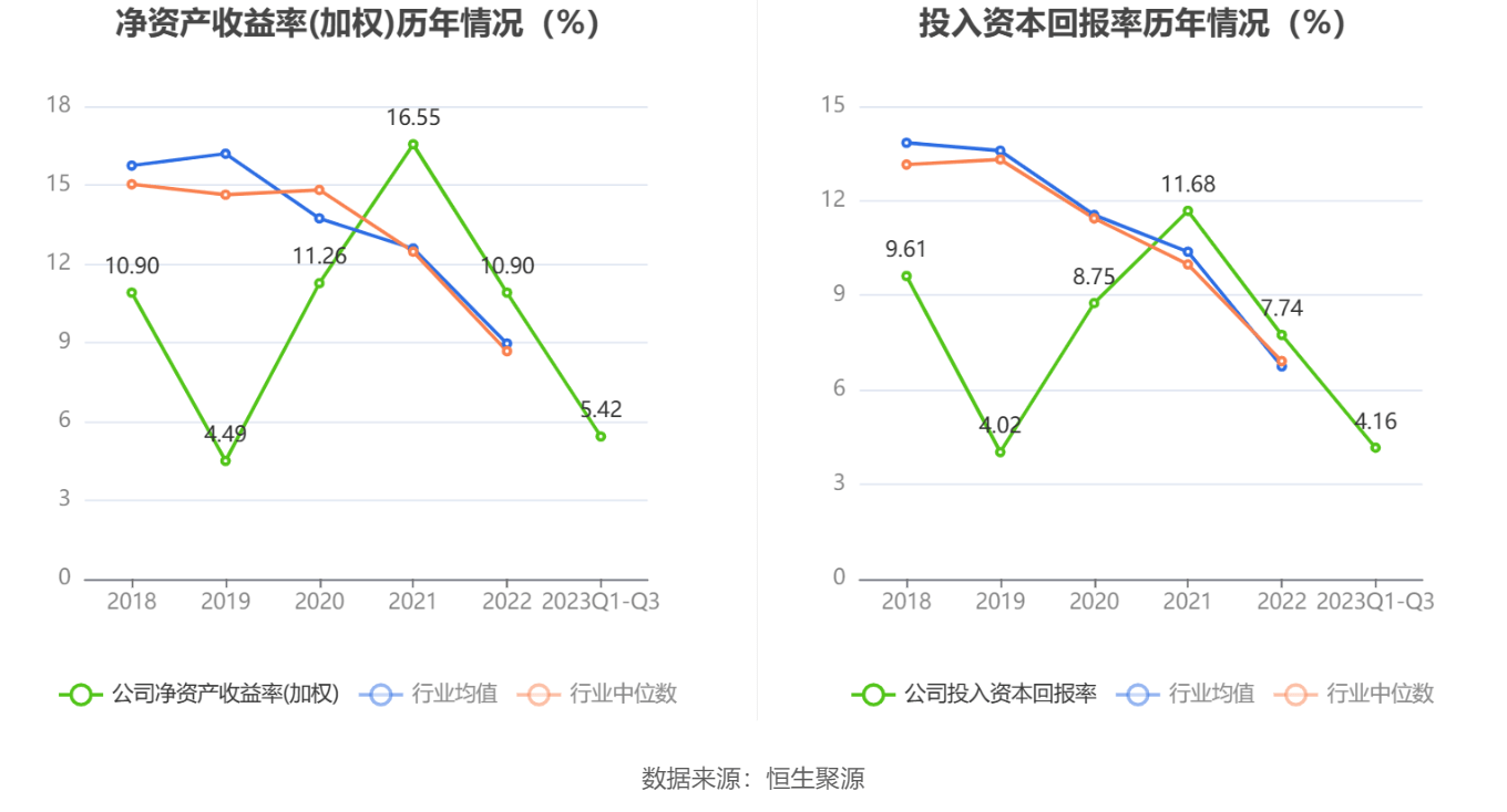 数据显示,2023年前三季度公司加权平均净资产收益率为5.42%,较上年同期下降1.98个百分点;公司2023年前三季度投入资本回报率为4.16%,较上年同期下降1.64个百分点。