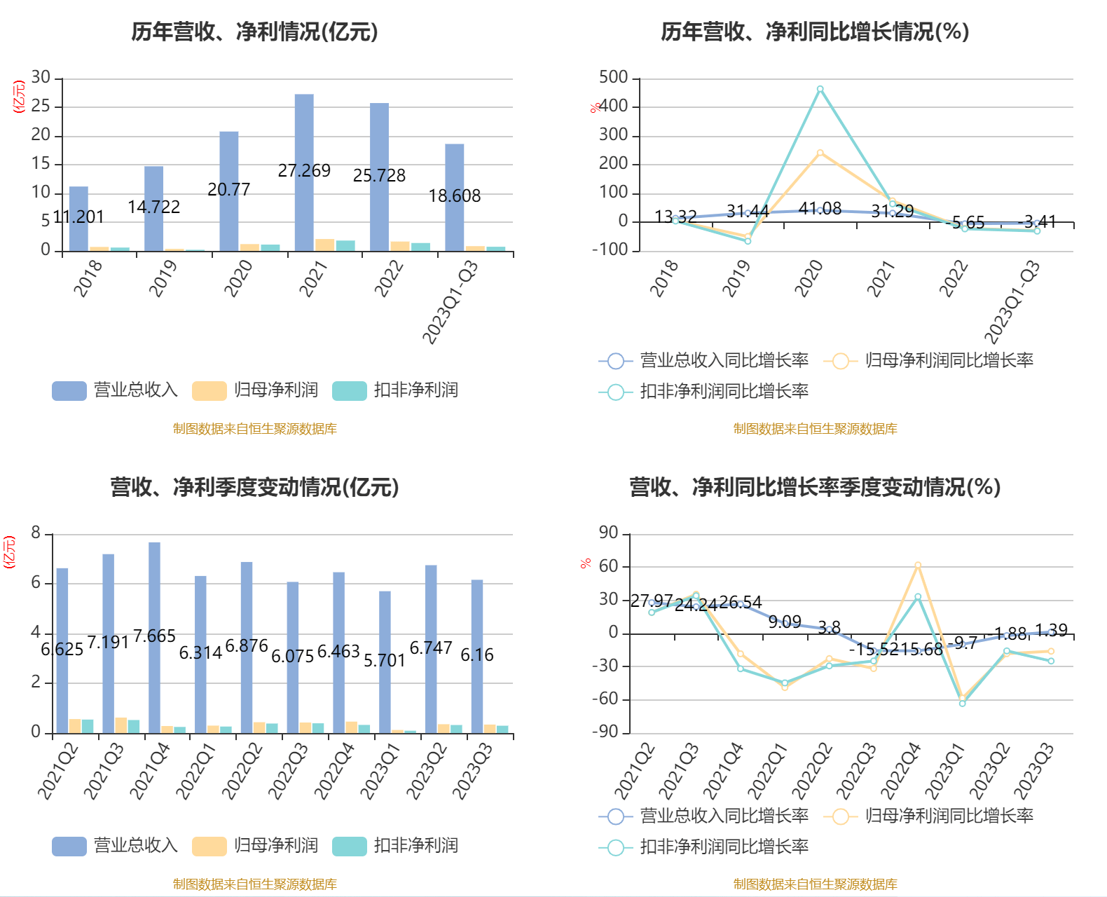 根据三季报,公司第三季度实现营业总收入6.16亿元,同比增长1.39%,环比下降8.71%;归母净利润3438.78万元,同比下降16.00%,环比下降3.80%;扣非净利润2974.74万元,同比下降24.88%,环比下降8.40%。