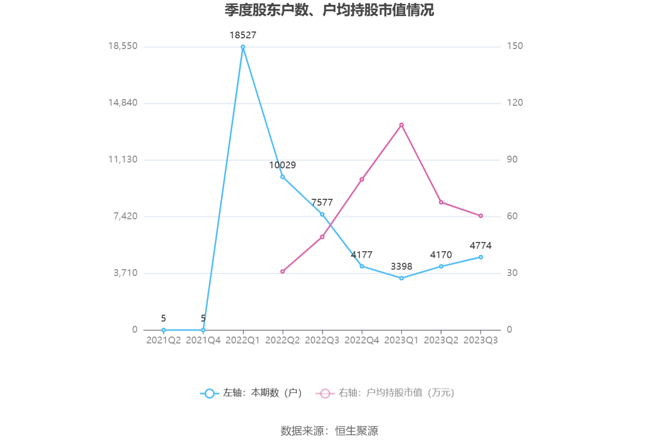 筹码集中度方面,截至2023年三季度末,公司股东总户数为4774户,较上半年末增长了604户,增幅14.48%;户均持股市值由上半年末的67.61万元下降至60.48万元,降幅为10.55%。