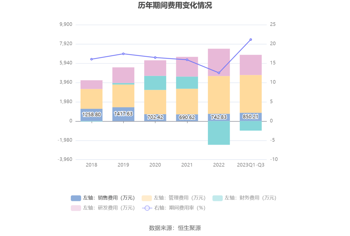 2023年前三季度,公司期间费用为5816.34万元,较上年同期增加3556.44万元;期间费用率为21.13%,较上年同期上升13.03个百分点。其中,销售费用同比增长49.37%,管理费用同比增长45.17%,研发费用同比增长10.14%,财务费用由去年同期的-2861.02万元变为-982.57万元。