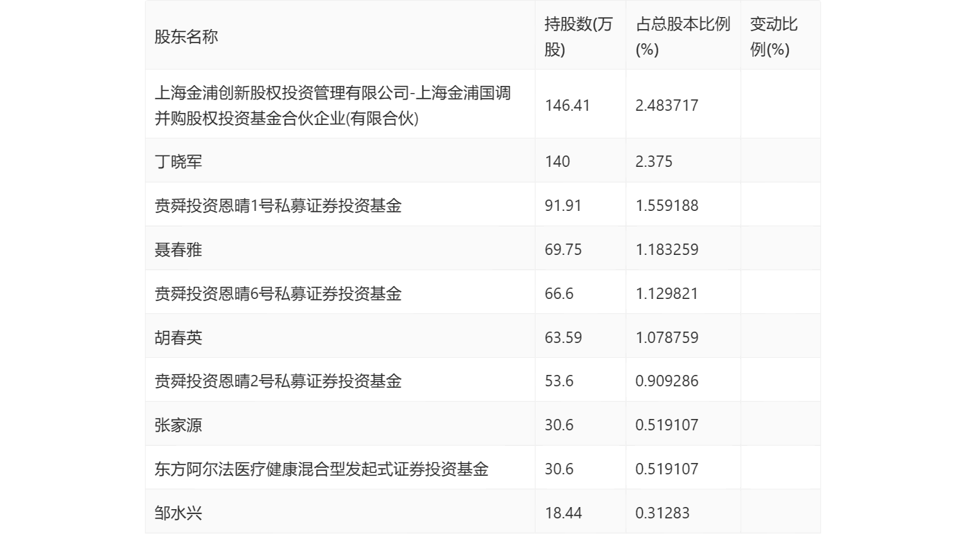 三季报显示,2023年三季度末的公司十大流通股东中,新进股东为张家源、邹水兴,取代了二季度末的社保基金17042组合、鹏华高质量增长混合型证券投资基金。在具体持股比例上,聂春雅、贲舜投资恩晴6号私募证券投资基金、胡春英、贲舜投资恩晴2号私募证券投资基金持股有所上升,上海金浦国调并购股权投资基金合伙企业(有限合伙)、东方阿尔法医疗健康混合型发起式证券投资基金持股有所下降。