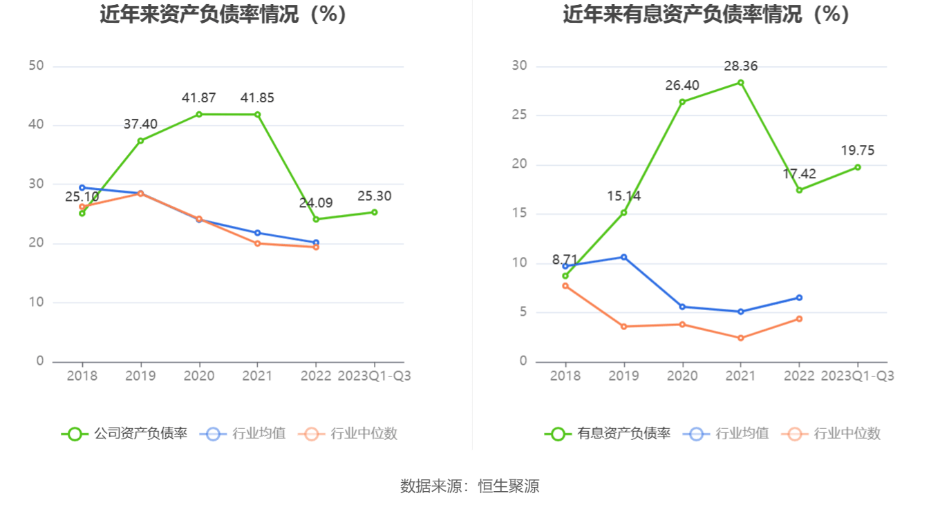 在偿债能力方面,公司2023年三季度末资产负债率为25.30%,相比上年末上升1.21个百分点;有息资产负债率为19.75%,相比上年末上升2.33个百分点。
