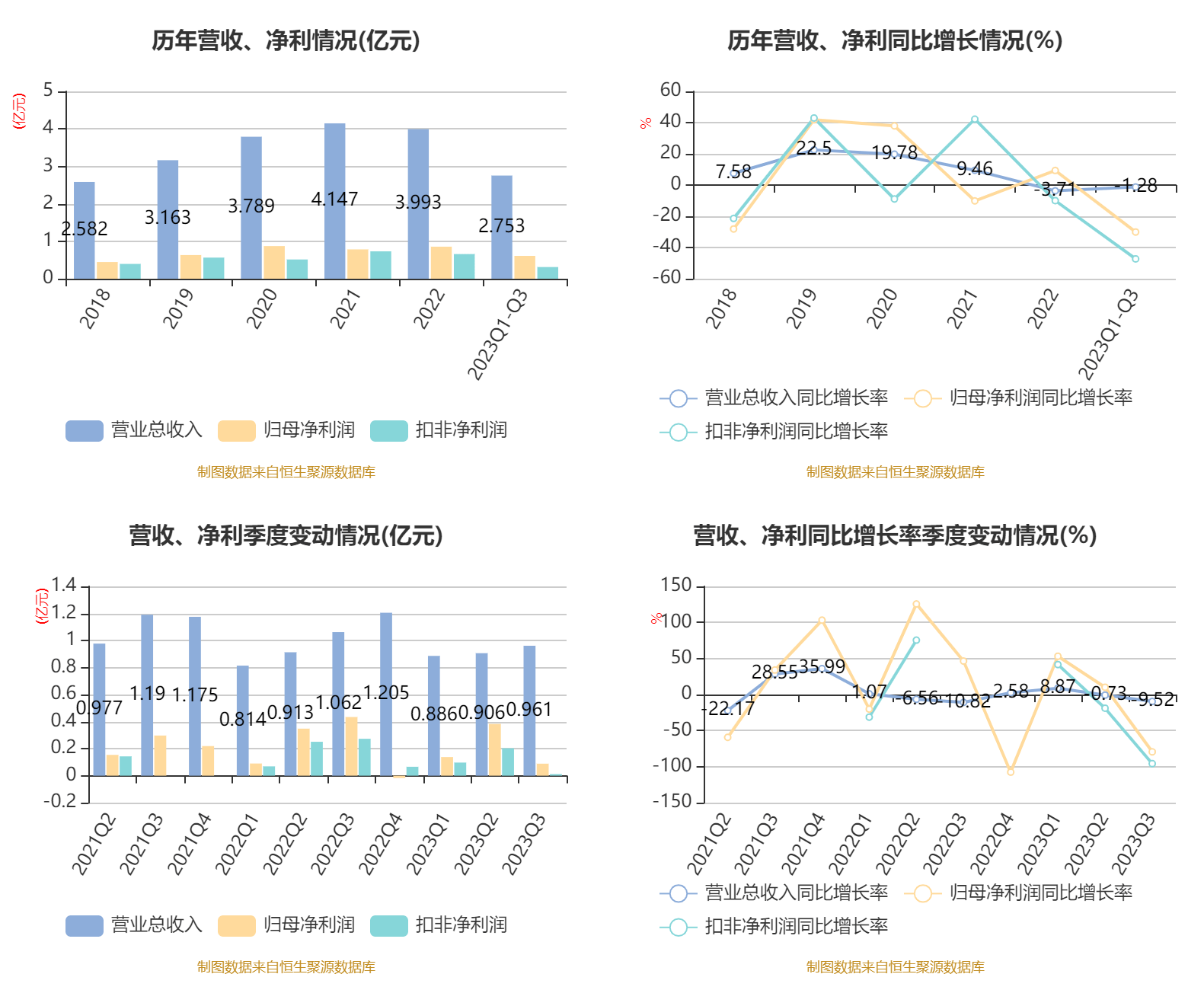 根据三季报,公司第三季度实现营业总收入9605.42万元,同比下降9.52%,环比增长5.99%;归母净利润889.1万元,同比下降79.42%,环比下降76.80%;扣非净利润115.59万元,同比下降95.76%,环比下降94.31%。