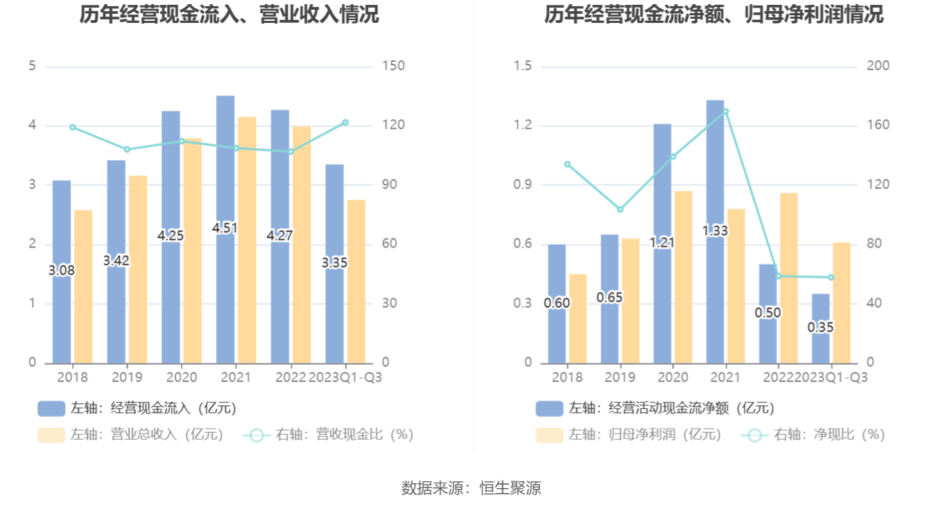 2023年前三季度,公司营业收入现金比为121.80%,净现比为57.82%。