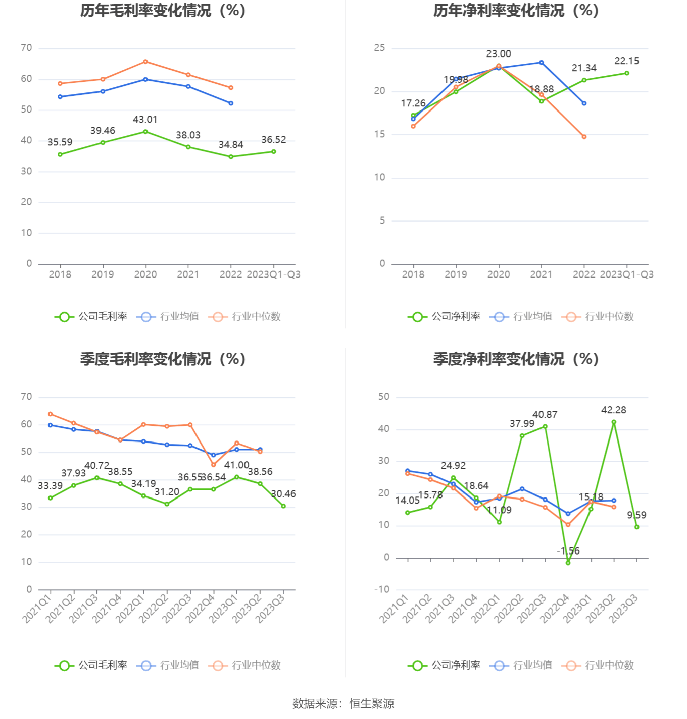2023年前三季度,公司毛利率为36.52%,同比上升2.41个百分点;净利率为22.15%,较上年同期下降9.09个百分点。从单季度指标来看,2023年第三季度公司毛利率为30.46%,同比下降6.09个百分点,环比下降8.10个百分点;净利率为9.59%,较上年同期下降31.28个百分点,较上一季度下降32.69个百分点。