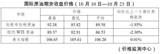 根据国家发改委消息,新一轮成品油调价窗口将于今天(10月24日)24时开启。据国家发改委价格监测中心监测,本轮成品油调价周期内(10月10日—10月23日)国际油价震荡下降。平均来看,伦敦布伦特、纽约WTI油价比上轮调价周期下降2.12%。
