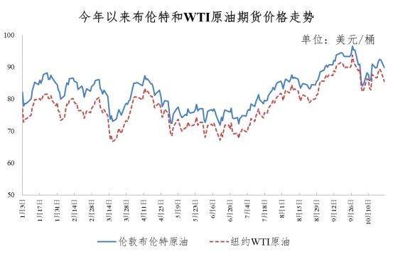 调价周期内,美国原油产量创历史新高对油价产生打压,但中东局势持续紧张,油价降幅收窄。美国能源信息署数据显示原油产量达到1320万桶/日,为有史以来最高水平。此外,美国将委内瑞拉部分能源贸易制裁暂停6个月,全球原油供应可能出现增长,投机资金抛售原油期货,油价一度大跌3%。但巴以冲突仍在进行中,以色列对加沙地带发动地面攻势,市场担忧冲突扩大进而扰乱生产、运输,油价降幅明显收窄。平均来看,本轮调价周期伦敦布伦特、纽约WTI油价分别比上个调价周期下降1.93%、2.30%。
