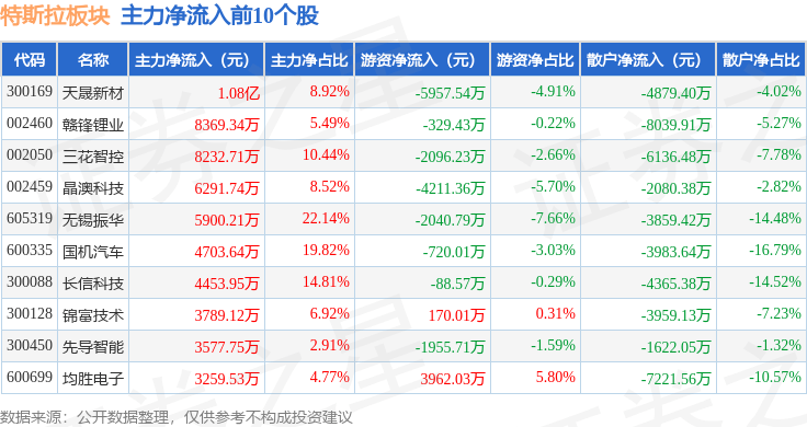 从资金流向上来看,当日特斯拉板块主力资金净流出5819.51万元,游资资金净流入8345.73万元,散户资金净流出2526.22万元。特斯拉板块个股资金流向见下表: