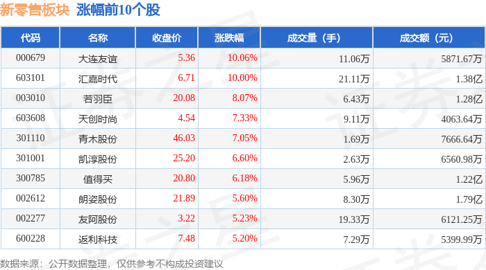 证券之星消息,10月24日新零售板块较上一交易日上涨2.4%,大连友谊领涨。当日上证指数报收于2962.24,上涨0.78%。深证成指报收于9483.9,上涨0.61%。新零售板块个股涨跌见下表: