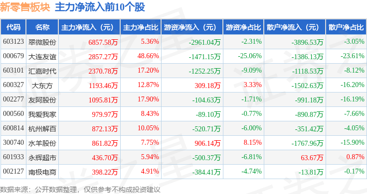 从资金流向上来看,当日新零售板块主力资金净流出4328.63万元,游资资金净流出1.23亿元,散户资金净流入1.66亿元。新零售板块个股资金流向见下表: