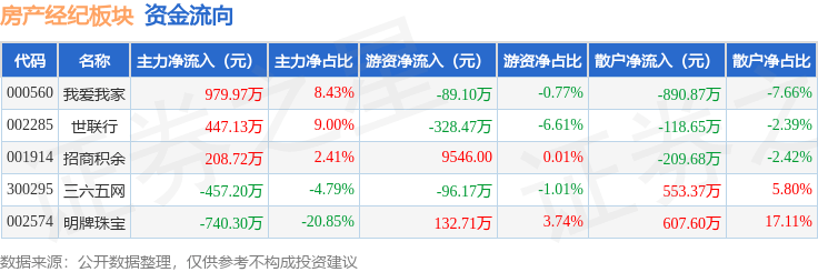 从资金流向上来看,当日房产经纪板块主力资金净流入438.32万元,游资资金净流出380.08万元,散户资金净流出58.24万元。房产经纪板块个股资金流向见下表:
