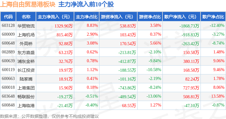 从资金流向上来看,当日上海自由贸易港板块主力资金净流出3644.62万元,游资资金净流出7351.43万元,散户资金净流入1.1亿元。上海自由贸易港板块个股资金流向见下表: