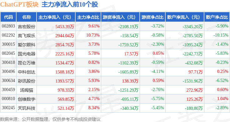 从资金流向上来看,当日ChatGPT板块主力资金净流出2.24亿元,游资资金净流出2.29亿元,散户资金净流入4.54亿元。ChatGPT板块个股资金流向见下表: