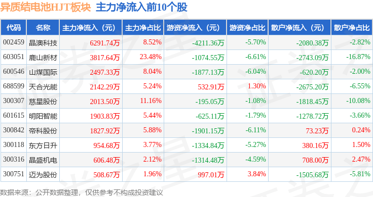 从资金流向上来看,当日异质结电池HJT板块主力资金净流出2.3亿元,游资资金净流出1.39亿元,散户资金净流入3.68亿元。异质结电池HJT板块个股资金流向见下表: