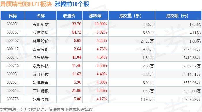 证券之星消息,10月24日异质结电池HJT板块较上一交易日上涨0.8%,鹿山新材领涨。当日上证指数报收于2962.24,上涨0.78%。深证成指报收于9483.9,上涨0.61%。异质结电池HJT板块个股涨跌见下表:
