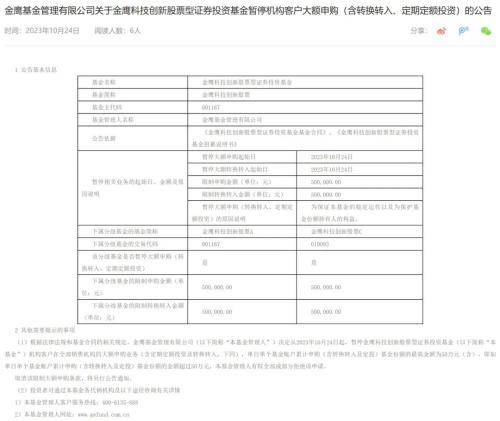 10月24日,金鹰基金发布公告称,为保证基金稳定运作和持有人利益,暂停金鹰科技创新机构客户在全部销售机构的大额申购业务,单日单个账户累计申购金额最高为50万元。
