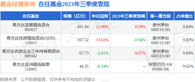 证券之星消息,截止2023年三季度末,基金经理张坤旗下共管理4只基金,本季度表现最佳的为易方达优质企业三年持有期混合(009342),季度净值涨0.67%。