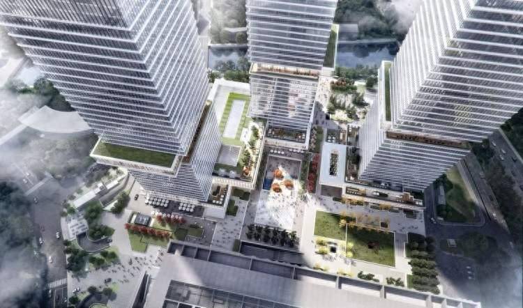 三栋高楼外形独特,围合出7000平方米的共享中央广场,与上海博物馆东馆上下贯通,融合城市功能,实现工作与生活、生活与文化的无界贯通。
