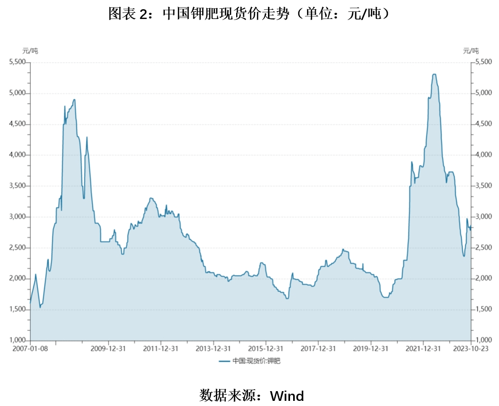 据Wind数据,2023年10月23日,中国钾肥现货价格为2870元/吨,相比2013—2020年钾肥2000元/吨左右的均价,或仍有下行空间。