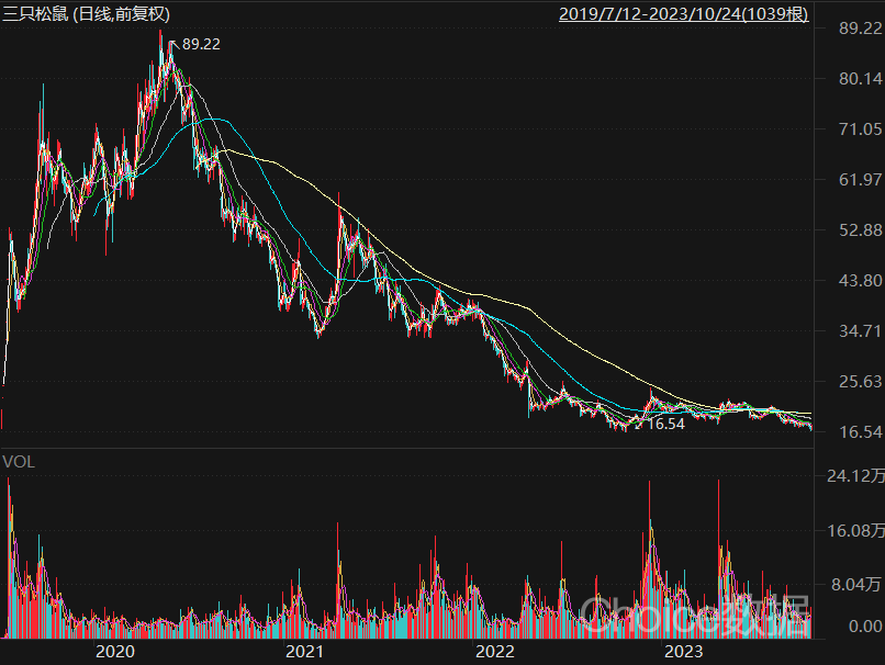 10月23日,公司股价还触及16.70元/股的年内新低。截至10月24日收盘,三只松鼠报17.64元。有投资者对此调侃,“90元时买了三只松鼠,如今只剩下半只”。