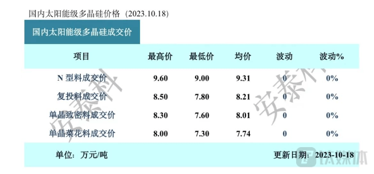 2022年,硅料价格曾经触及300元/kg高点。中国有色金属工业协会硅业分会(以下简称“硅业分会”)数据显示,上周N型硅料成交价在9.0-9.6万元/吨,成交均价为9.31万元/吨,单晶致密料成交价在7.6-8.3万元/吨,成交均价为8.01万元/吨,均环比持平。