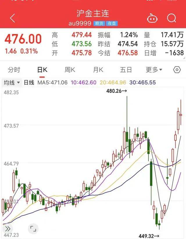 10月23日,沪金主连收于476元/克,该指数自10月12日以来,走势呈典型的“V形”反转,价格上涨超25元/克。