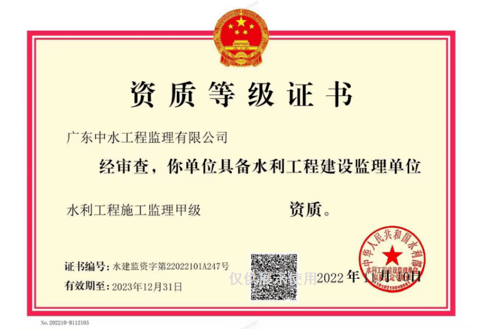 作为已在水利监理深耕了10多年的企业,中水监理已拥有水利部水利工程监理甲级资质,长期以来是粤东地区唯一具备该资质的公司,同时在广东省行业内也具有一定知名度。此外,公司还拥有住建部房屋建设、市政公用工程监理乙级资质,并已具备部分升甲的业绩,计划将在一年内升至甲级资质。