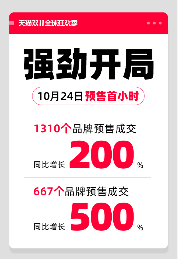 10月24日晚8点,2023年天猫双11开启预售,品牌成交开局即迎来强劲增长。1小时内,成交额同比增长超200%的品牌达1300多个,成交同比超500%的品牌数近700个。珀莱雅、欧莱雅、海尔、斐乐、兰蔻、美的、娇兰、耐克等品牌成交额争相破亿,花至、且初等国货新品牌也跻身“亿元俱乐部”。
