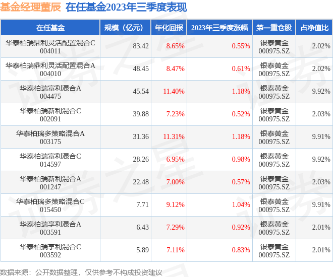 董辰在担任华泰柏瑞新利混合A(001247)基金经理的任职期间累计任职回报26.8%,平均年化收益率为7.79%。期间重仓股调仓次数共有32次,其中盈利次数为22次,胜率为68.75%;翻倍级别收益有1次,翻倍率为3.12%。