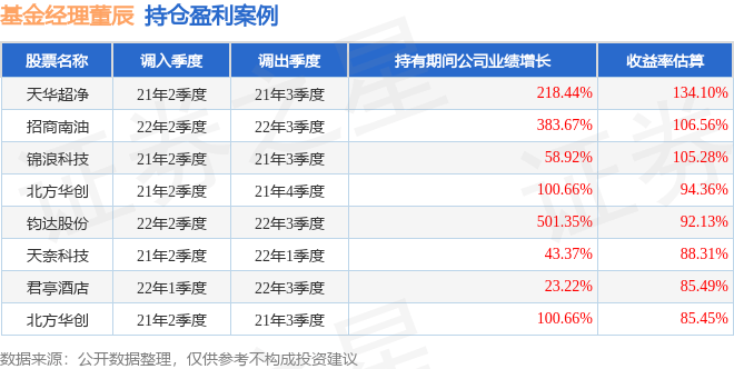 董辰管理的华泰柏瑞景气优选A基金在21年2季度买入天华超净,在持有1个季度后在21年3季度卖出。持有期间的估算收益率为134.1%,持有期间天华超净在2020年到2021年的年报归属净利润增幅达218.44%。