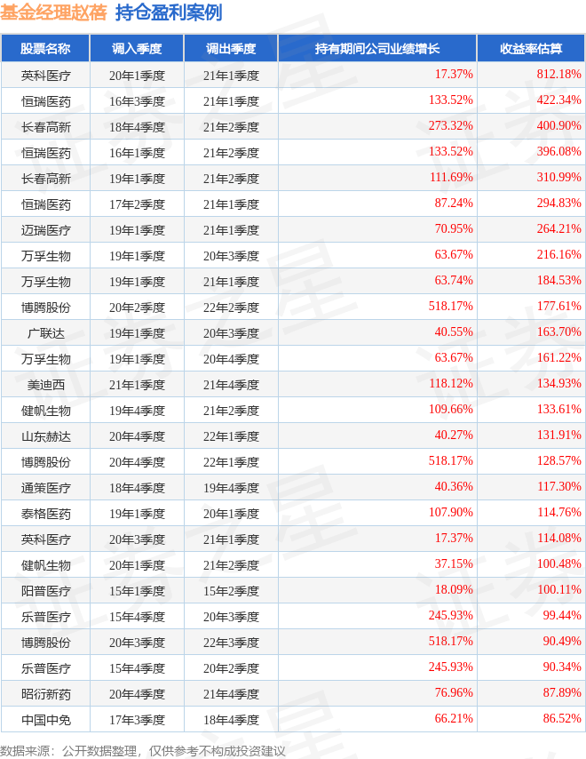 赵蓓管理的工银医疗保健股票基金在20年1季度买入英科医疗,在持有1年又0个季度后在21年1季度卖出。持有期间的估算收益率为812.18%,持有期间英科医疗在2020年到2021年的年报营业总收入增幅达17.37%。