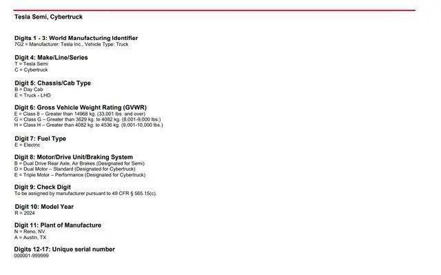 特斯拉在向客户交付汽车之前,必须向国家公路交通安全管理局(NHTSA)提交VIN解码器文件并进行验证。车辆识别号(VIN)是用于识别道路上所有车辆的唯一数字,其中包含有关车辆的许多信息。