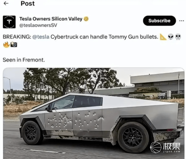 前几日,有国外网友@Tesla Owners Silicon Valley发布了一段视频,内容讲述了网友在路上偶遇特斯拉Cybertruck,而车门上全是坑坑洼洼的,似乎全是子弹打出来的痕迹,引来了520万人的围观。