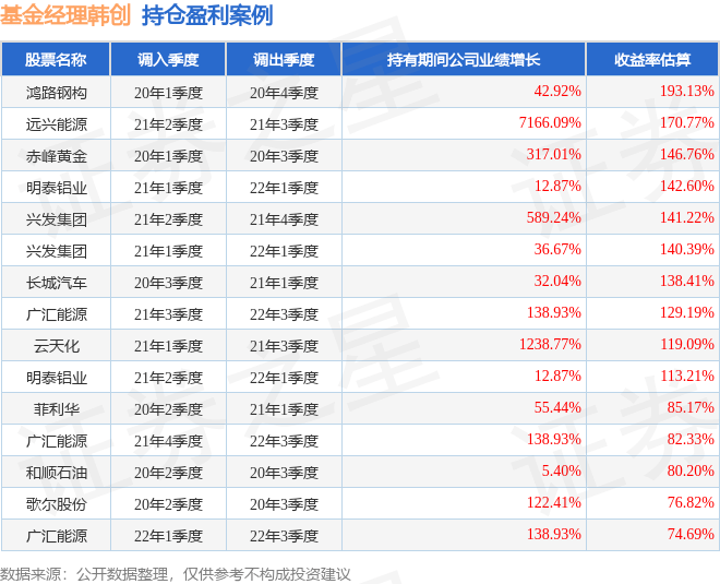 韩创管理的大成睿景灵活配置混合A基金在20年1季度买入鸿路钢构,在持有3个季度后在20年4季度卖出。持有期间的估算收益率为193.13%,持有期间鸿路钢构在2019年到2020年的年报归属净利润增幅达42.92%。