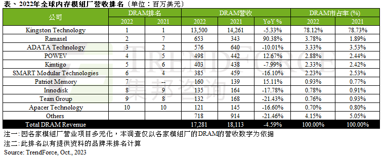 尽管终端市场需求不佳,但基于 Kingston 品牌规模,加上完整的产品供应链,使得其营收衰退幅度较小,仅同比下降 5.3%,稳居市占排名第一。