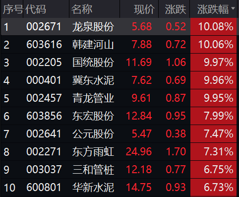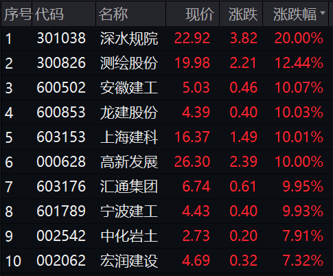 个股方面,深水规院20CM涨停,安徽建工、龙建股份、上海建科、高新发展、龙泉股份、韩建河山等十余只个股集体涨停。