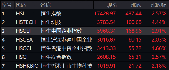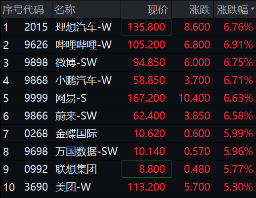 港股市场大幅高开:恒指涨2.79%,收复17000点;恒生国企涨3.34%,恒生科技大涨4.53%。截至发稿仍保持明显涨幅,理想汽车、哔哩哔哩、微博、小鹏汽车、蔚来等全线大涨。