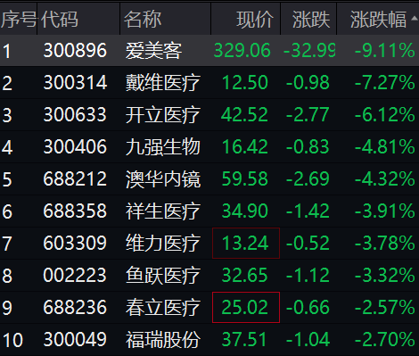 医疗器械板块同步走低,戴维医疗、开立医疗、九强生物等跌幅居前。