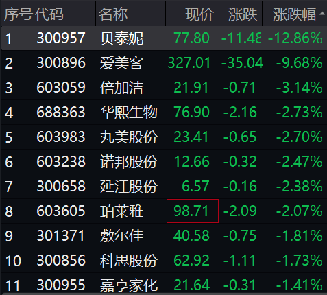 个股方面,贝泰妮大跌13%,爱美客跌近10%,倍加洁、华熙生物、丸美股份等多股走低。