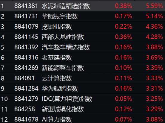 盘面上,大基建领涨市场,钢铁、水务、工程机械等板块走高,算力股走高,酒企、贵金属、汽车反弹。医美概念大跳水,光刻机、光模块等持续回调。