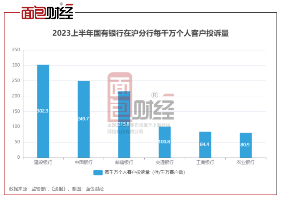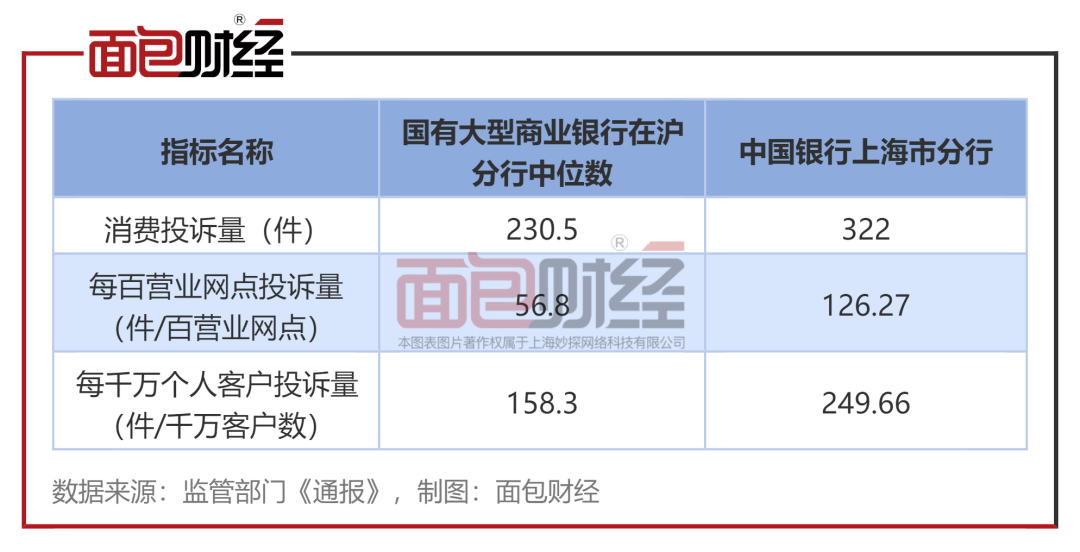 数据显示,国有大型商业银行在沪分行的平均每千万个人客户投诉量的中位数为158.3件/千万个人客户,中国银行的投诉量是中位数的1.58倍。