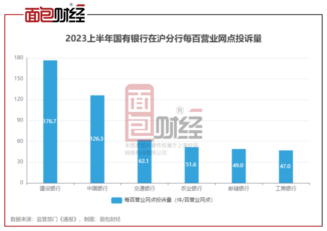 数据显示,国有大型商业银行在沪分行的平均每百营业网点投诉量的中位数为56.8件/百营业网点,建设银行的投诉量是中位数的2.22倍。