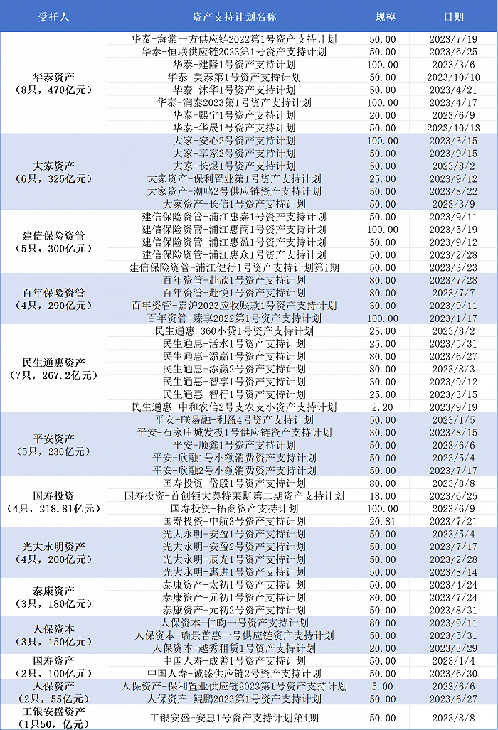 13家设立资产支持计划的机构中,华泰资产、大家资产、建信保险资管、百年保险资管、民生通惠资产、平安资产、国寿投资和光大永明资产年内累计登记资产支持计划规模均达到200亿元以上。