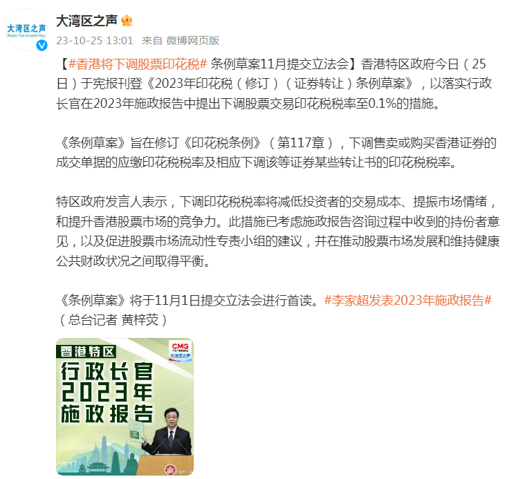 香港特区政府今日(25日)于宪报刊登《2023年印花税(修订)(证券转让)条例草案》,以落实行政长官在2023年施政报告中提出下调股票交易印花税税率至0.1%的措施。