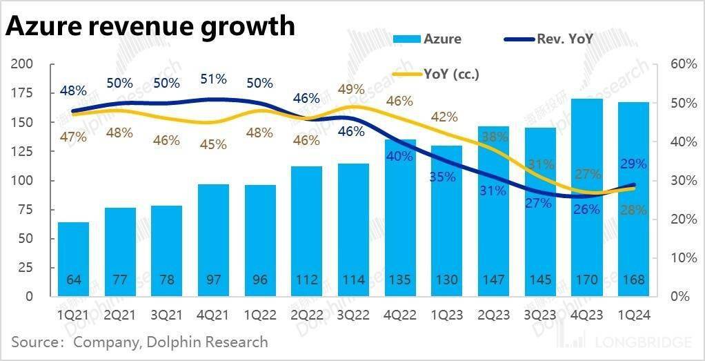 2. AI 开始兑现,云计算需求反转已来?核心的本季实现营收 168 亿美元,同比增速在连续 7 个季度放缓后,本季终于重新提速到 29%。虽然有基数影响和美元汇率从利空变利好的影响。但这个关键的增长反转意味着:①自今年市场的投资的主线之一--AI 浪潮总算给企业带来了实际的增量云计算需求,并带动云服务商收入的增长;②欧美公司近几个季度以来,降本增效缩减云计算用量的周期已经结束。上述两个标志性事件至少发生了一个,或者二者兼有之。