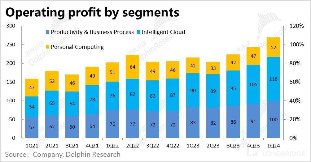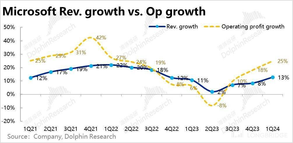 3)最终微软本季的经营利润达到了 269 亿美元,同比增幅达到 25%,也远超市场预期的约 241 亿经营利润。公司经营利润的增速再度远远领先营收增长,重回靠规模效应和产品提价,靠着不算高的营收增长,长期稳定实现更强利润增长的轨道内。