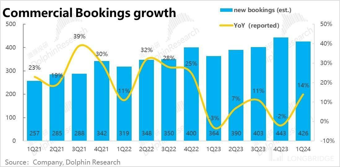 而反映当季增量的新签企业业务合同金额,却有不俗的增长,同比上升了 14%,虽然有去年同期是基数大底的利好,但仍能看出本季度企业新增的云计算和其他 IT 支出有所回升。