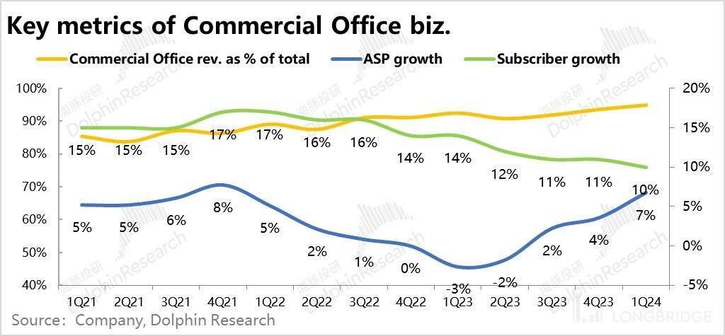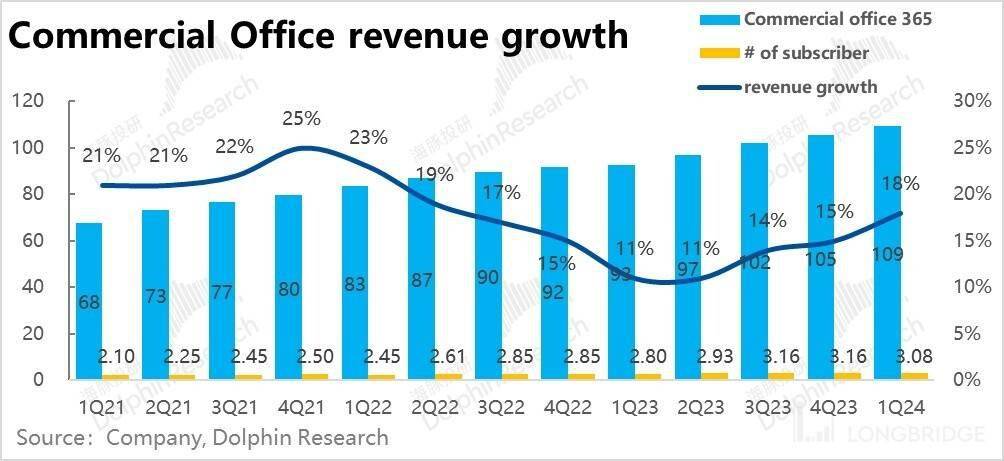 2)价的角度,本季度 Office 365 客单价同比上升了 7%。虽然去年同期是基数最低点也有影响,但据我们测算客单价上升了超 2 美元,海豚君认为先前Office Copilot 发布后,远超市场预期的定价驱动了 Office 平均客单价的明显提升,AI 浪潮在 Office 业务上也开始有明显的业绩贡献。