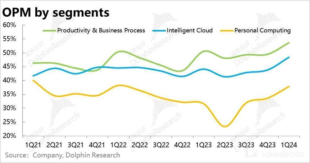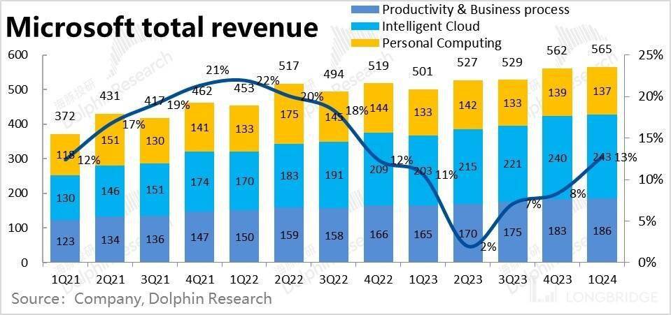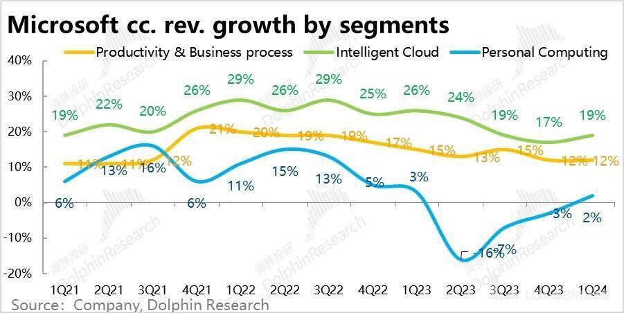 整体来看,微软本季实现营收 565 亿美元,明显高于市场预期的 545 亿,三大板块都小超预期,主要是个人计算业务的贡献,同比增速也由上季度的 8% 提升到 13%。