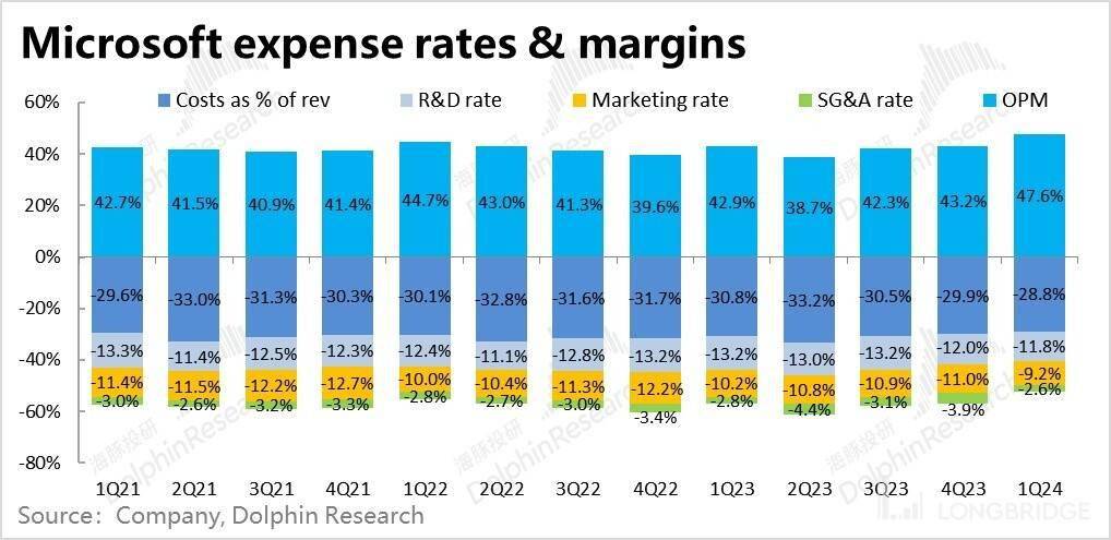 1)本季度实现毛利 402 亿美元,毛利率明显提升到 71.2%,同比环比来看都有不小的改善。据公司的解释,近两个季度毛利率持续提升主要是因为公司营收结构中高毛利业务占比提升,以及 AI 功能推出后,云计算和生产力板块主要产品提价。